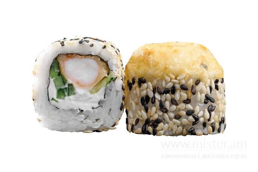 Рис, норі, сир Філадельфія, креветка смажена в темпурі, соус унагі, соус сирний, огірок, салат айсберг, кунжут.