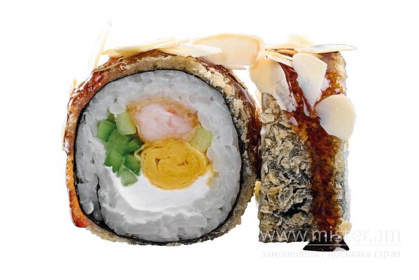 Рис, норі, креветка смажена в темпурі, японський омлет, сир Філадельфія, огірок, темпура, соус унагі, мигдальні пластівці.