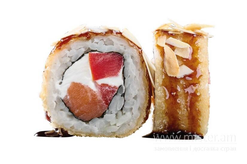 Рис, норі, сир Філадельфія, помідор, лосось, темпура, соус унагі , мигдальні пластівці.