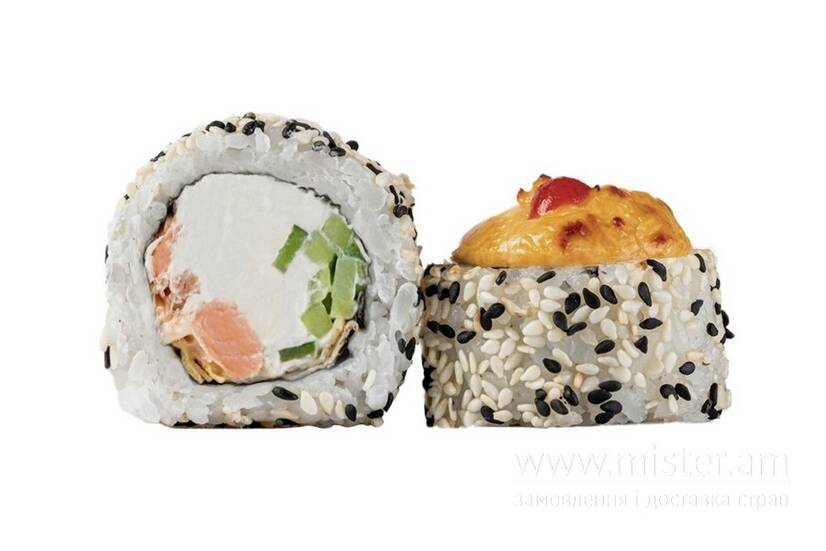 Рис, норі, сир Філадельфія, лосось печений, соус японский майонез, томаго, огірок, сирна подушка, соус шрирачі.