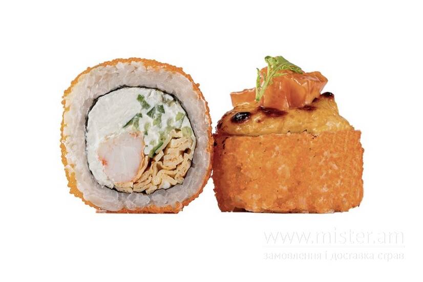 Рис, норі, сир Філадельфія, огірок, креветка, лосось, соус спайс, ікра масаго, томаго сирна подушка.