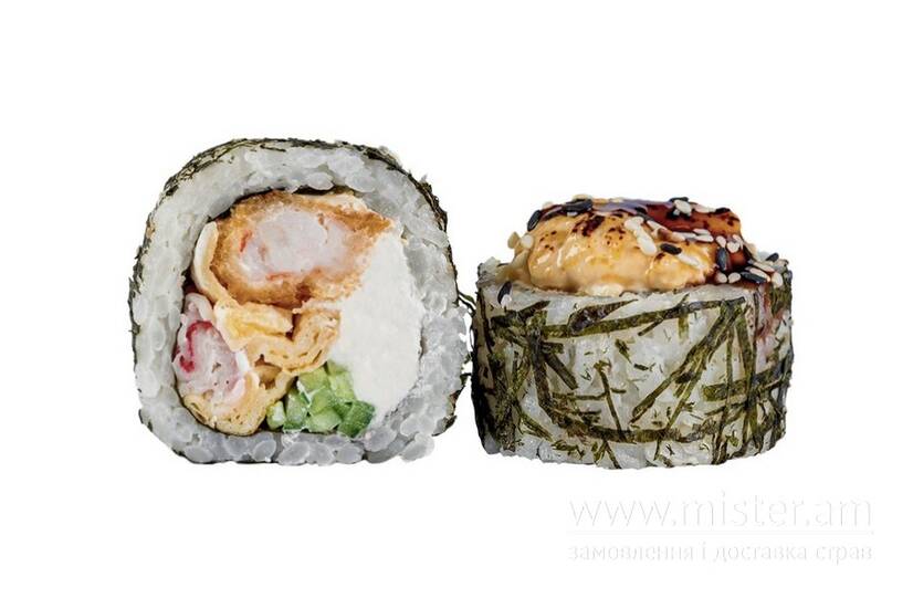 Рис, норі, сир Філадельфія, краб (сурімі), креветка , огірок, соус спайсі, томаго, сирна подушка, соус унагі, мікс кунжут.