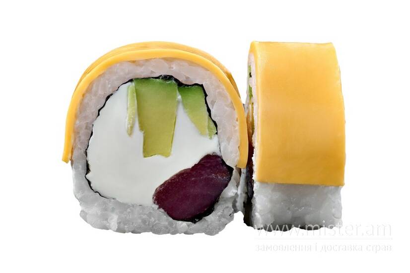 Рис, норі, сир Філадельфія, авокадо, тунець, сир чедер.