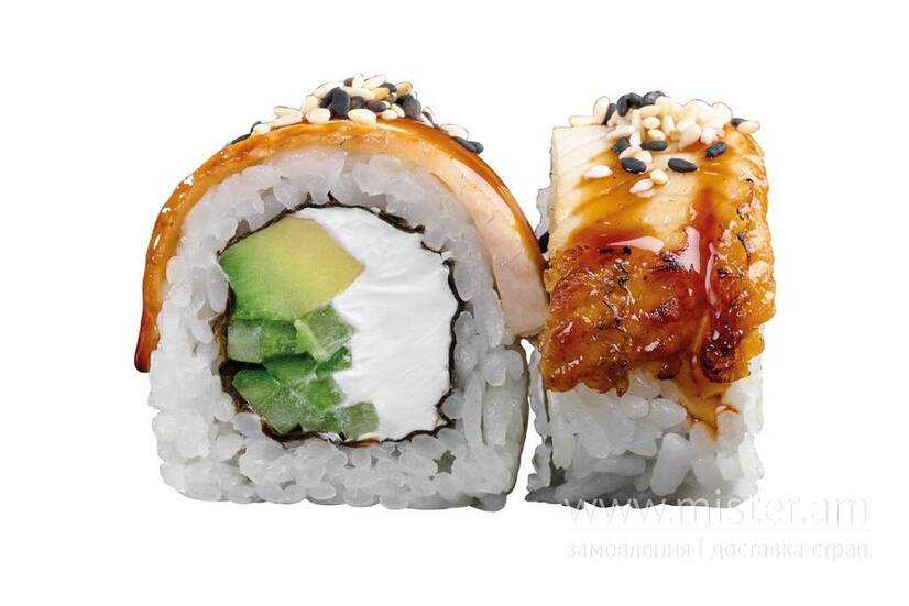 Рис, норі, вугор, сир Філадельфія, огірок, авокадо, соус унагі, кунжут.