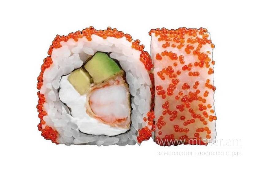 Рис, норі, сир Філадельфія, ікра, авокадо, креветка смажена в темпурі.