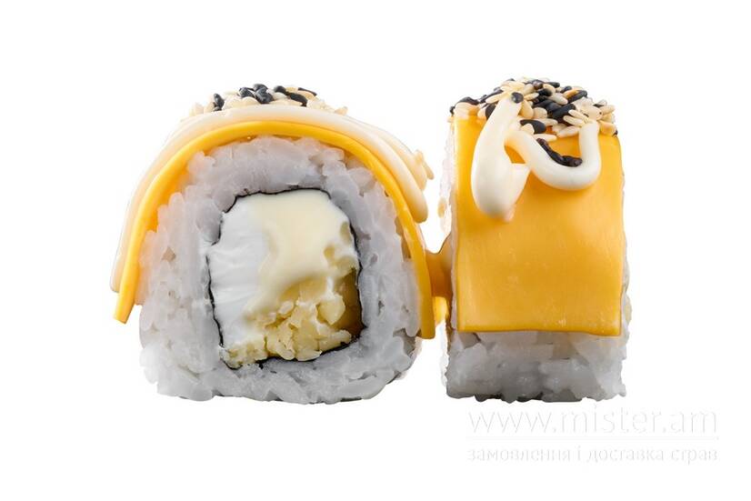 Рис, норі, мікс сирів (сир Філадельфія, сир традіцийний), кунжут, японський майонез, помідор, соус сирний.
