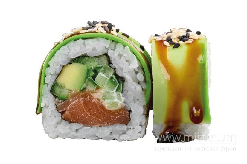 Рис, норі, лосось, авокадо, огірок, японський майонез, соус унагі, кунжут.