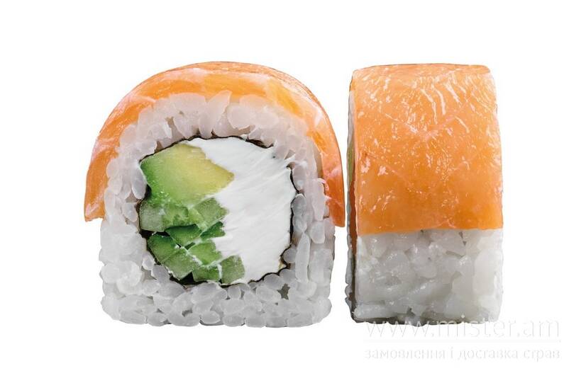 Рис, норі, лосось, сир Філадельфія, огірок, авокадо.