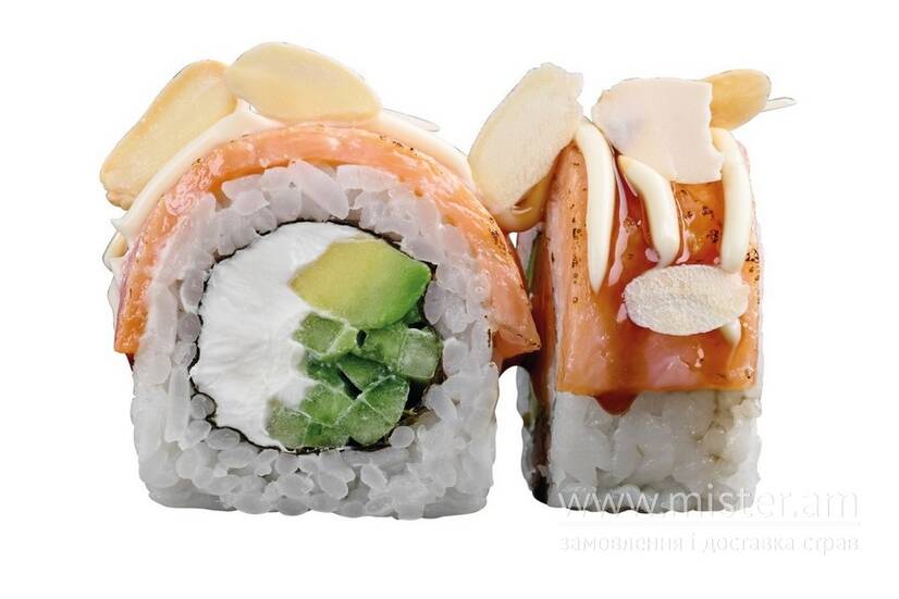 Рис, норі, грильований лосось, сир Філадельфія, огірок, авокадо, японський майонез, соус унагі, мигдальні пластівці.