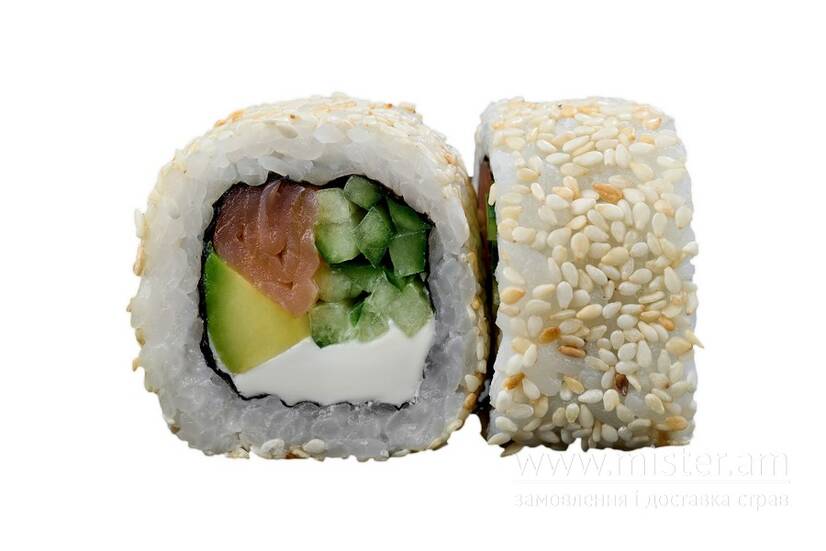 Рис, норі, сир філадельфія, лосось холодного копченя, огірок, авокадо, кунжут.
