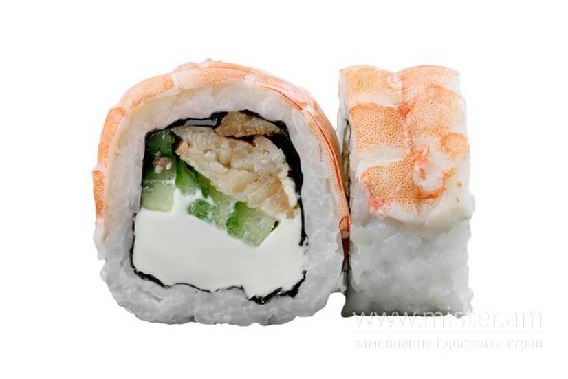 Рис, норі, сир Філадельфія, окунь унагі, огірок, майонез, креветки.