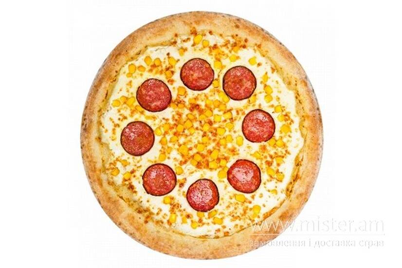 Соус вершковий, сир моцарела, салямі, кукурудза.