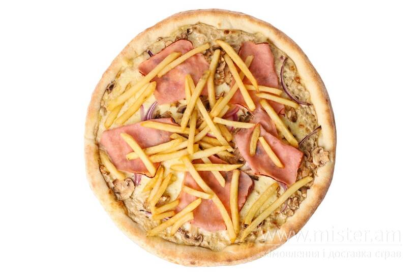 Моцарела, соус грибний, гриби, шинка котто, цибуля, картопля фрі.