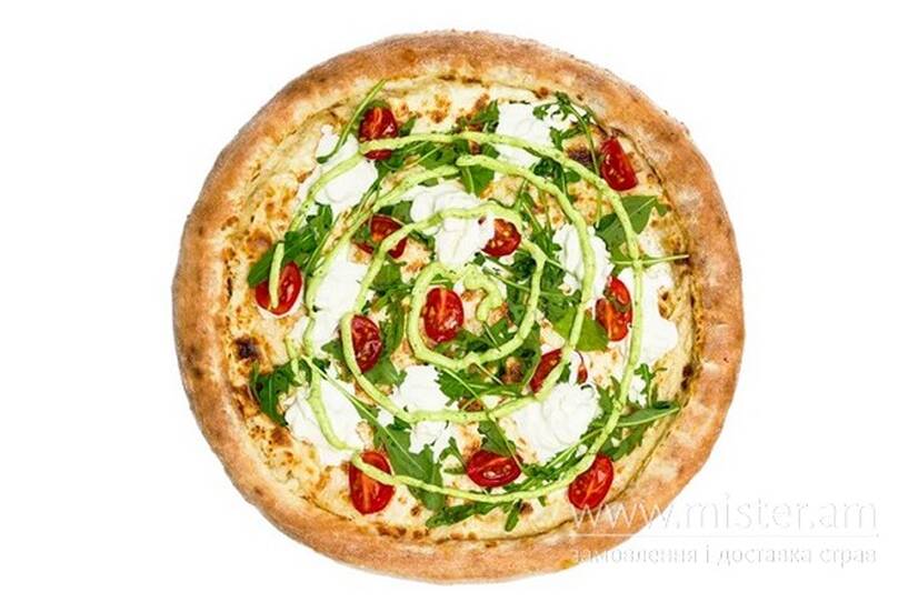 Вершки із спеціями, моцарелла, чері, рукола, страчателла, соус сальсаверде.