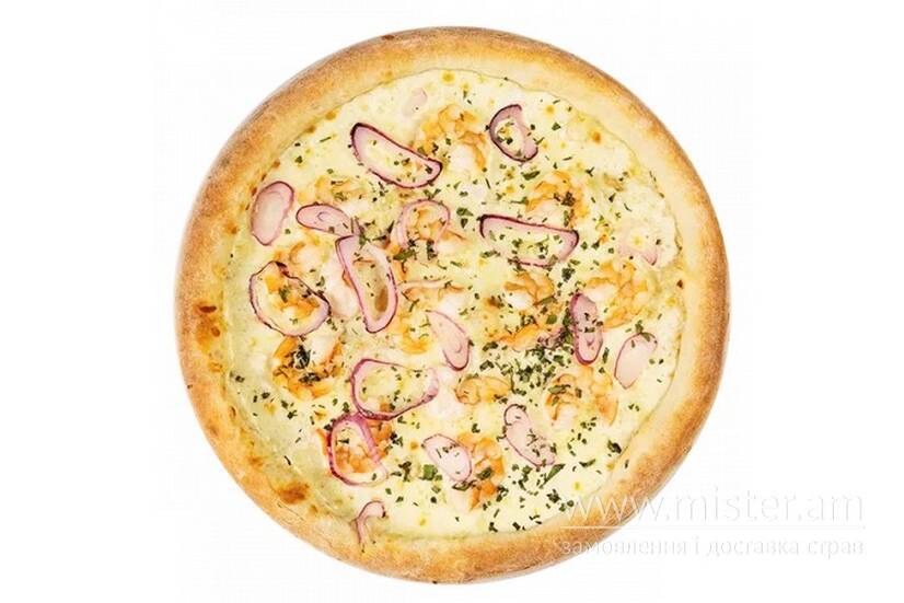 Вершкова основа, сир моцарела, креветка, цибуля синя, базилік.