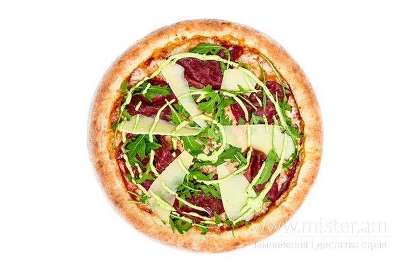 Томатний соус, моцарелла, брезаола, рукола, пармезан, соус сальсаверде.