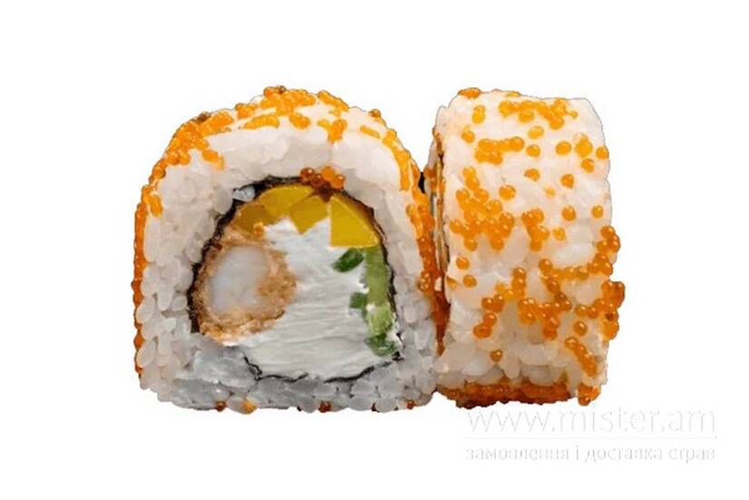 Рис, норі, сир Філадельфія, соус кімчі, майонез, огірок, манго, креветка, ікра тобіка.