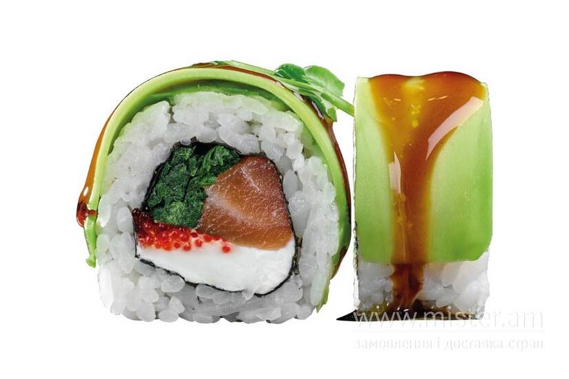 Рис, норі, сир Філадельфія, шпинат, лосось, авокадо, ікра, соус унагі, мікрогрін.