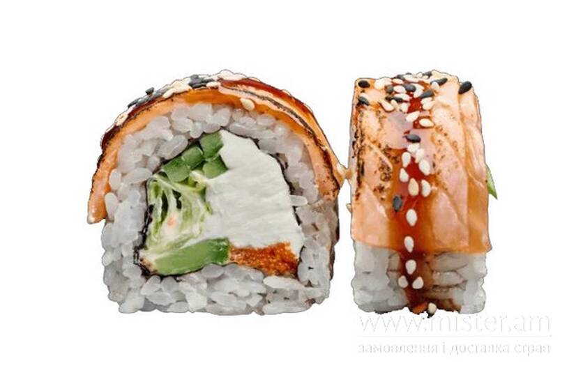 Рис, норі, сир Філадельфія, майонез, ікра масаго, авокадо, огірок, айсберг, лосось, соус теріякі, кунжут.
