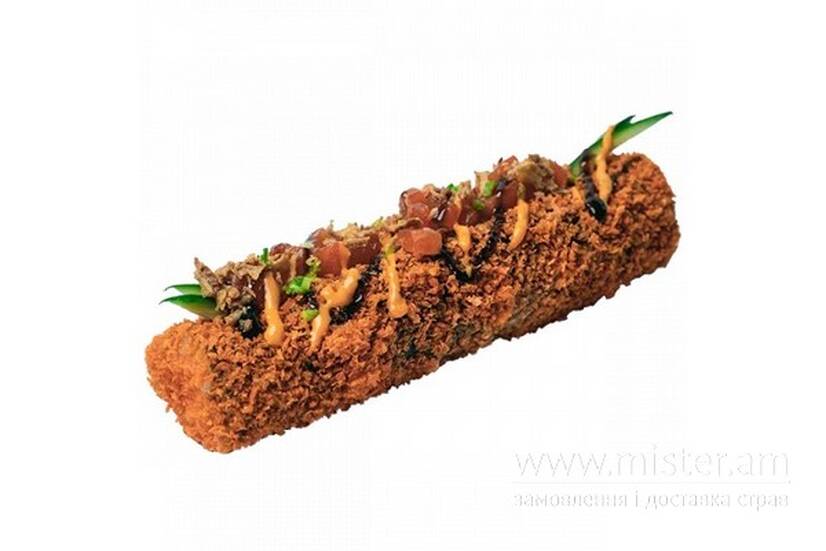 Рис, норі, сир Філадельфія, огірок, лосось, соус Унагі, соус шрирачі-майо, цибуля криспі, цибуля зелена, сухарі панко.