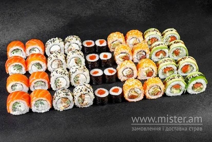 Каліфорнія з лососем, Філадельфія з огірком, Боніто з лососем, Зелений дракон, Лосось макі.