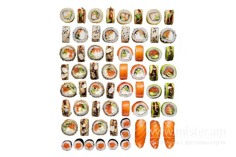 Філадельфія Класік, Базилік Рол, Зелений Дракон, Тамаго Ебі, Боніто з лососем, Темпура Сальмон, Лосось Макі, Нігірі Лосось 3 шт.