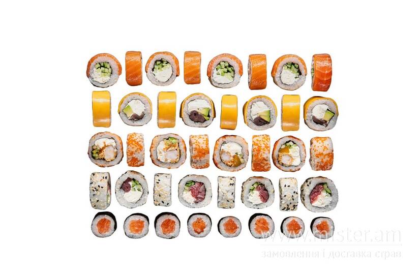 Філадельфія з огірком, Рол Мікадо, Чедер з тунцем, Лосось Макі, Каліфорнія з тунцем.