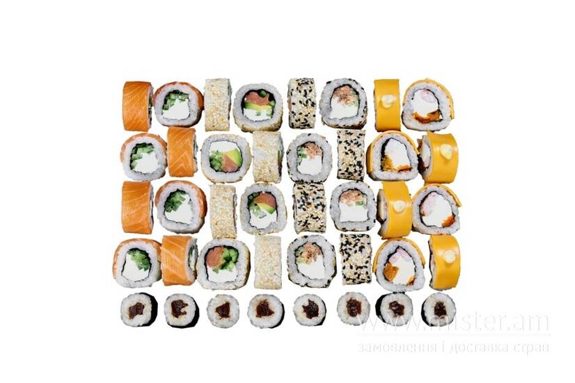 Філадельфія з огірком, Боніто з лососем, Філадельфія з копченим лососем, Сирний з Креветкаю, Макі з Кампіо.