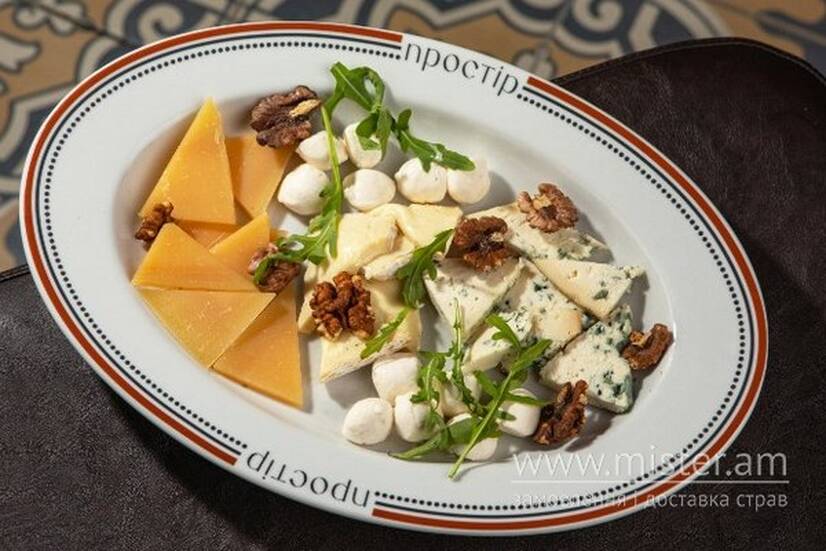 Вершковий ніжний сир Моцарелла в поєднані сирів з білою та голубою пліснявою, витриманим сиром Пармезан, грецьким горіхом та рукколою.
