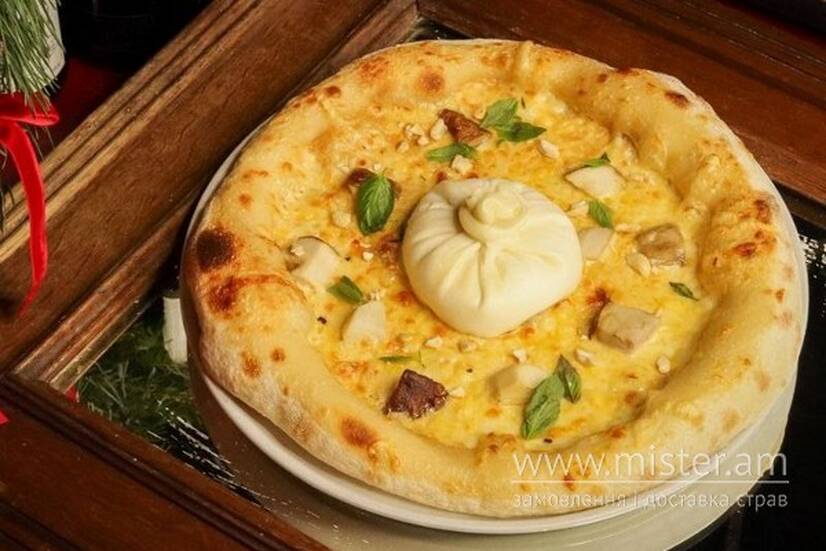 Піца на вершковій основі з крафтовою бурратою, моцарелою та гаудою з додаванням білих грибів, зелені та горіхів.
