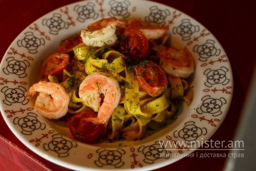 Тальятеле з обсмажени на вершковому маслі з часником, креветками, томатами Черрі, сиром Гауда та зеленню.
