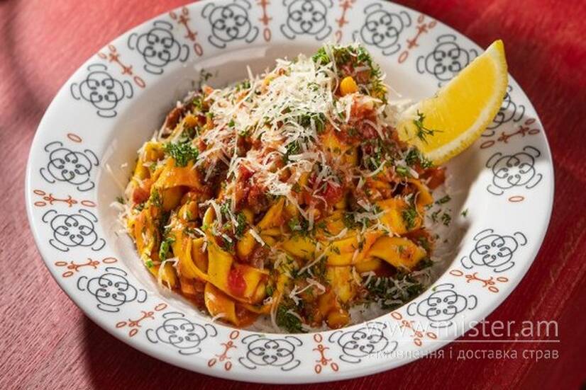 Тальятелле з беконом та яловичиною на томатному соусі з болгарським перцем, кукурудзою та кримською цибулею, сиром Гауда, зеленню та лимоном.