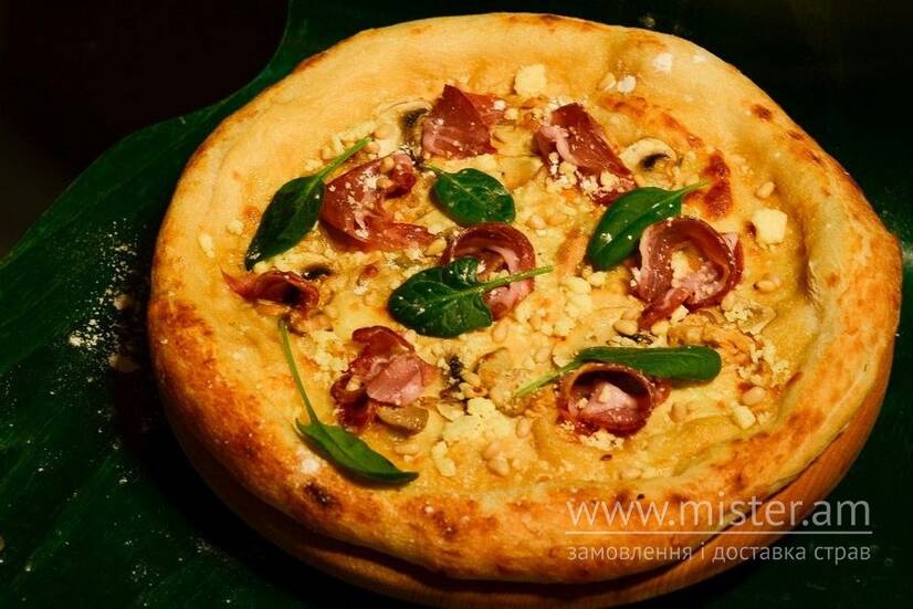 Солоно-копчений шовдар гармонічно поєднується з насиченими смаками вершкового соусу, карпатської бринзи та білих грибів. Піца довершується смаками ніжної курки, моцарелли, печериць, свіжого шпинату та кедрового горіха.