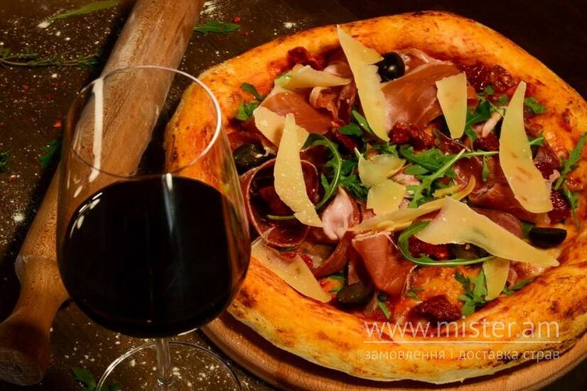 Вишуканий смак прошуто підкреслюється карпатським шовдарем, соусом маринара, а також пряною руколою, освіжаючими маслинами та в`яленими томатами. Довершуючи кульмінацію, шеф додає ніжну моцарелу та витриманий пармезан.