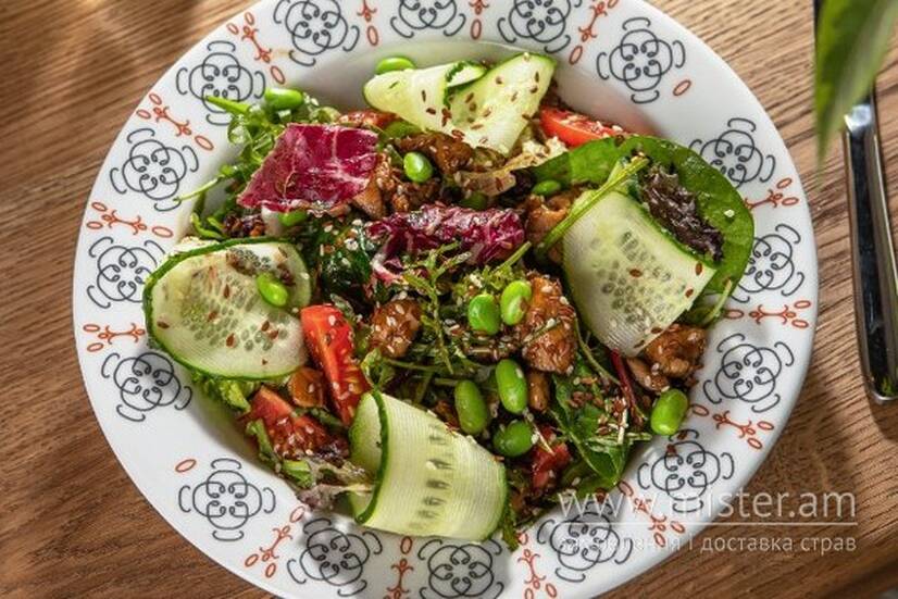 Поєднання свіжого міксу салату та філе фермерської курки в соусі Теріякі зі свіжим огірком, томатами Черрі, бобами Едамаме під цитрусовою олією та міксом насіння.
