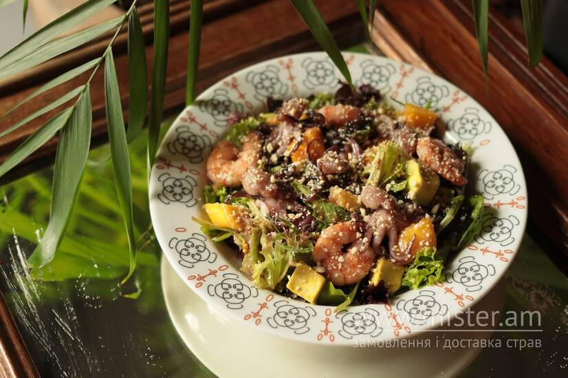 Поєднання креветок, восьминога з міксом салату, авокадо, манго, горіхами кеш`ю та довершується манго соусом.