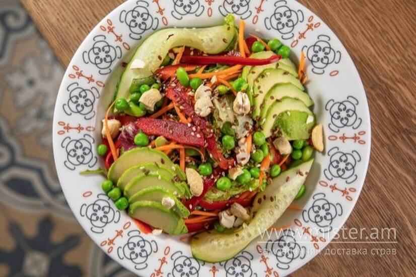 Легкий овочевий салат зі свіжим огірком, болгарським перцем, морквою, авокадо, зеленим горошком, бобами Едамаме під пікантно-солодким соусом з горіхами кешью та міксом насіння.