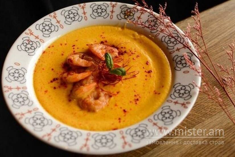 Ніжний крем-суп з соковитого гарбуза в поєднанні тигрових креветок - справжнє помаранчеве задоволення.