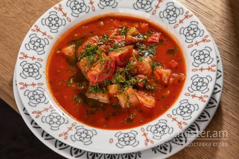 Класичний італійський томатний густий суп зі свіжих овочів з додаванням зеленого горошку, томатів Черрі та зелені.