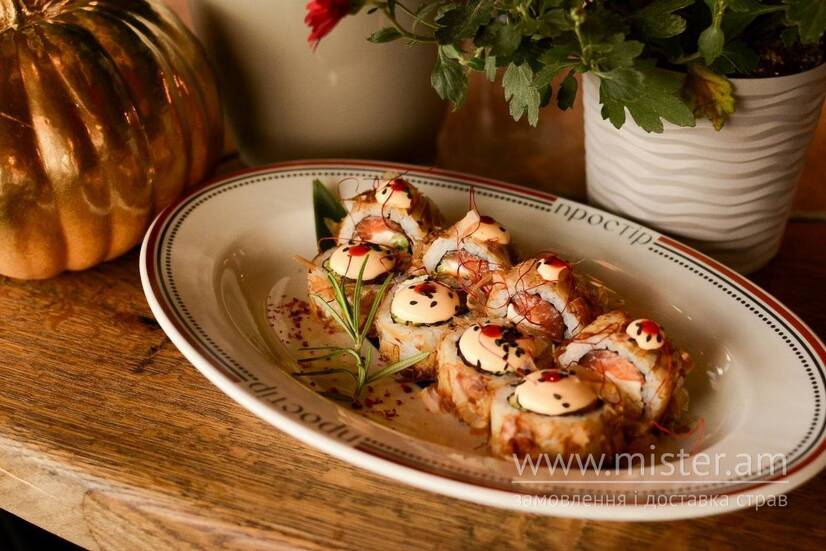Поєднання лосося, крем-сиру та огірка зі стружкою тунця та спайсі соусом посипаного кунжутом та чилі-ниткою.