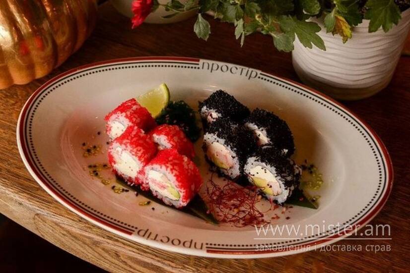 Філадельфія в червоній та чорній ікрі з креветкою та авокадо.