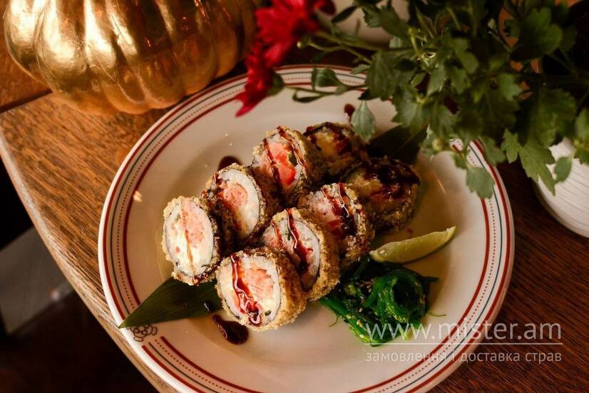 Обсмажений в Панко рол з лососем, крем-сиром, болгарським перцем та зеленою цибулею.