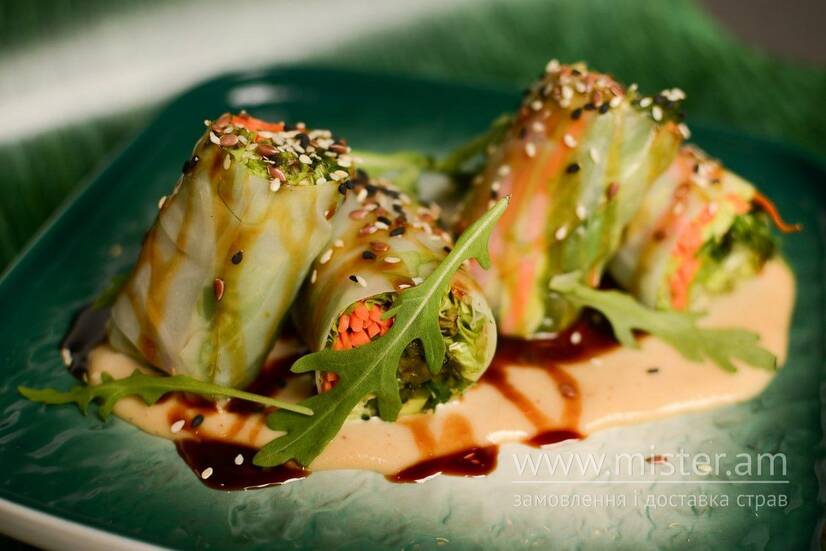 Яскравий смак весняної свіжості поєднує в собі асорті з овочів: мікс салату, хрустка морква, ніжний авокадо та салат Чука. Рол подається на подушці з горіхового соусу та довершується міксом насіння та соусом унагі.