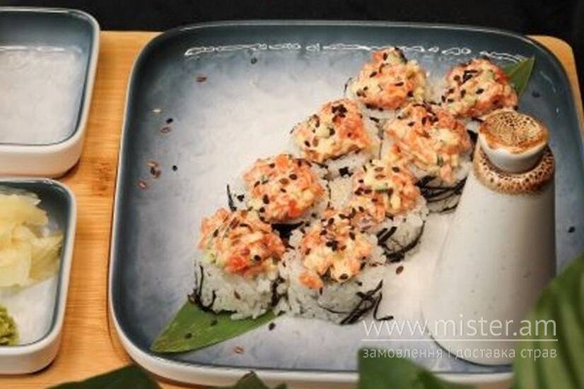 Рол з ніжним крем-сиром Філадельфія, омлетом томаго, в стружці норі подаємо з шапочкою з тартаром з лосося і спайсі соусом.