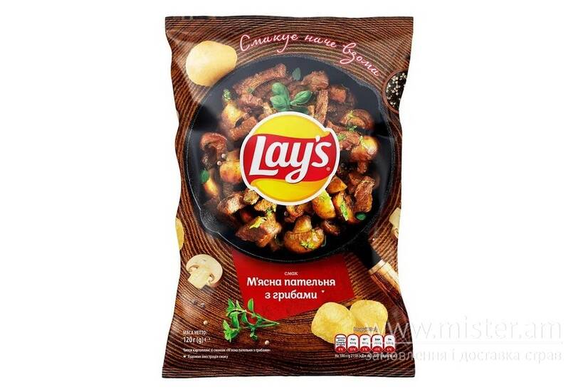 Чипси Lay`s М`ясна пательня з грибами — хрусткі картопляні чипси з виразним смаком "м`ясна пательня з грибами".