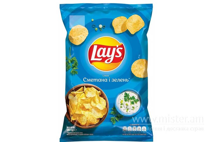 Чипси Lay`s Сметана та зелень — ніжні вершкові чипси з ароматом свіжої зелені.