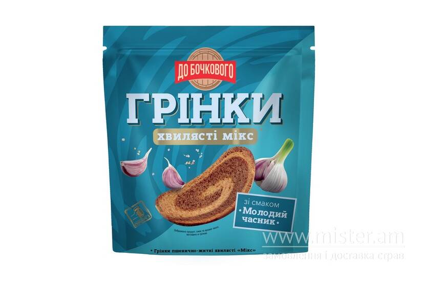 Грінки пшенично-житні хвилясті "Мікс" зі смаком "Молодий часник" - хрусткі хвилясті грінки мають насичений аромат та пікантний смак свіжого молодого часнику.