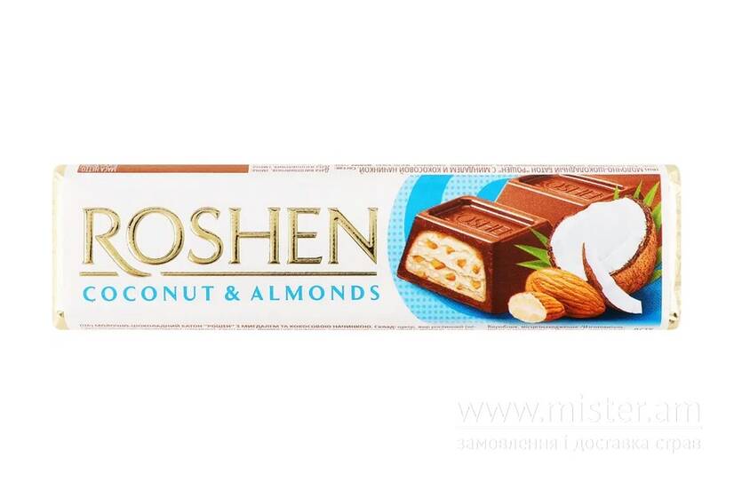 Батончик Рошен Кокос-мигдаль - молочно-шоколадний батончик з кокосовою крихтою та подрібненим мигдалем.