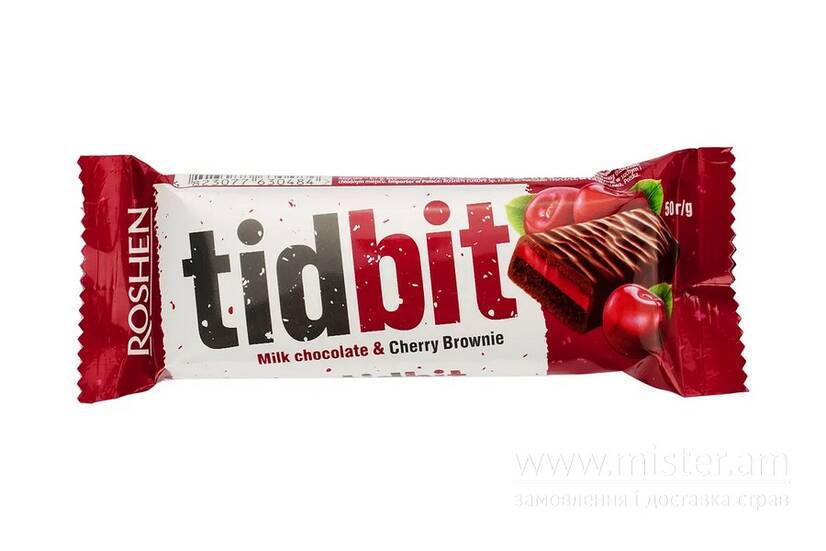 Батончик Рошен ТідБіт Вишневий Брауні - молочний шоколад із начинкою з темного бісквіту та вишневого желе, що поєднує насичений смак шоколаду, вишні та бісквіту.