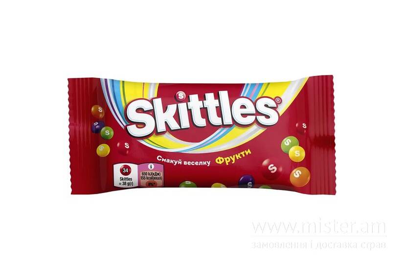 Драже Skittles Фрукти - жувальні драже з яскравими фруктовими смаками: полуниця, лимон, апельсин, лайм і чорна смородина. Хрустка цукрова оболонка та соковита начинка.